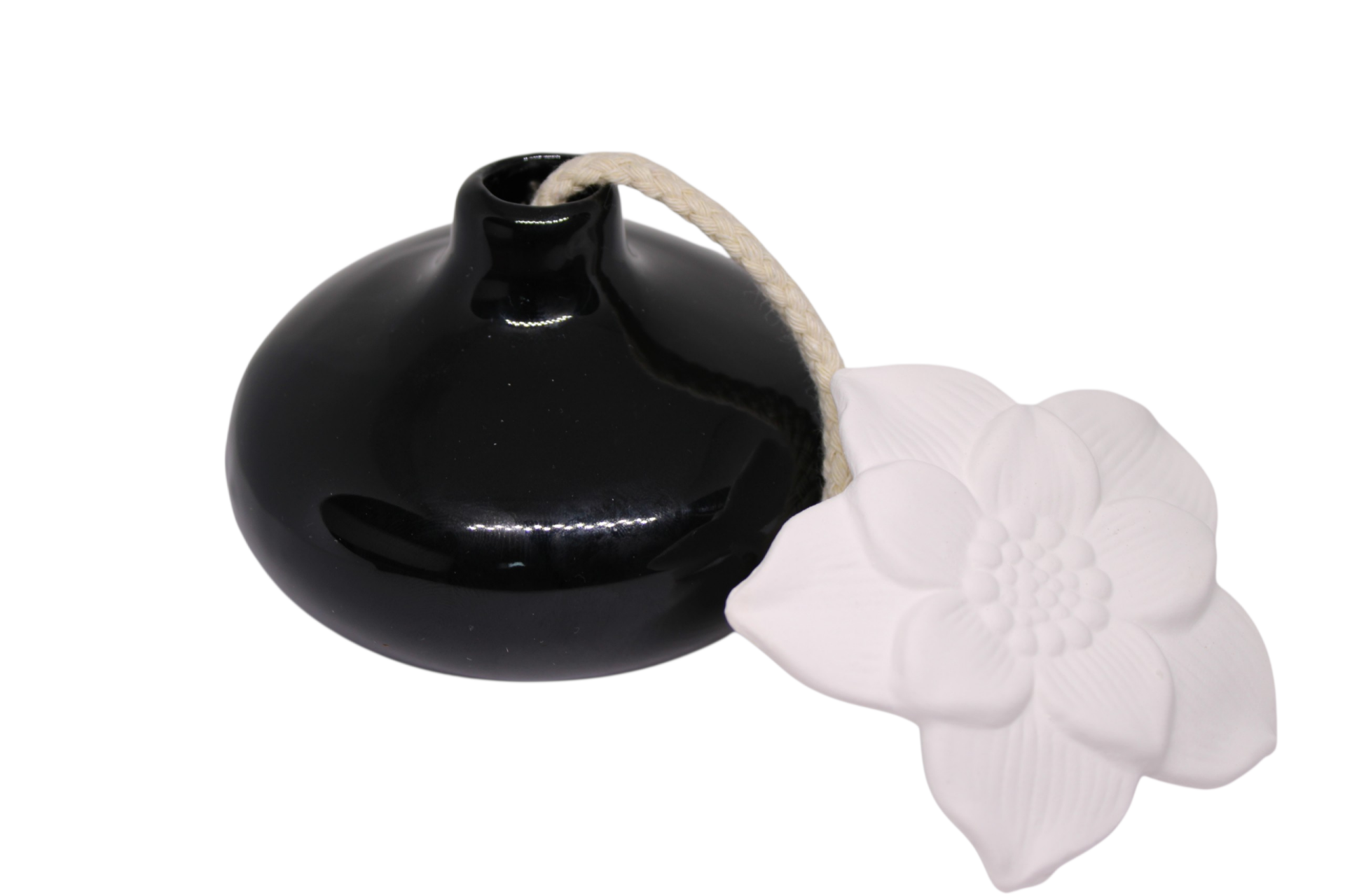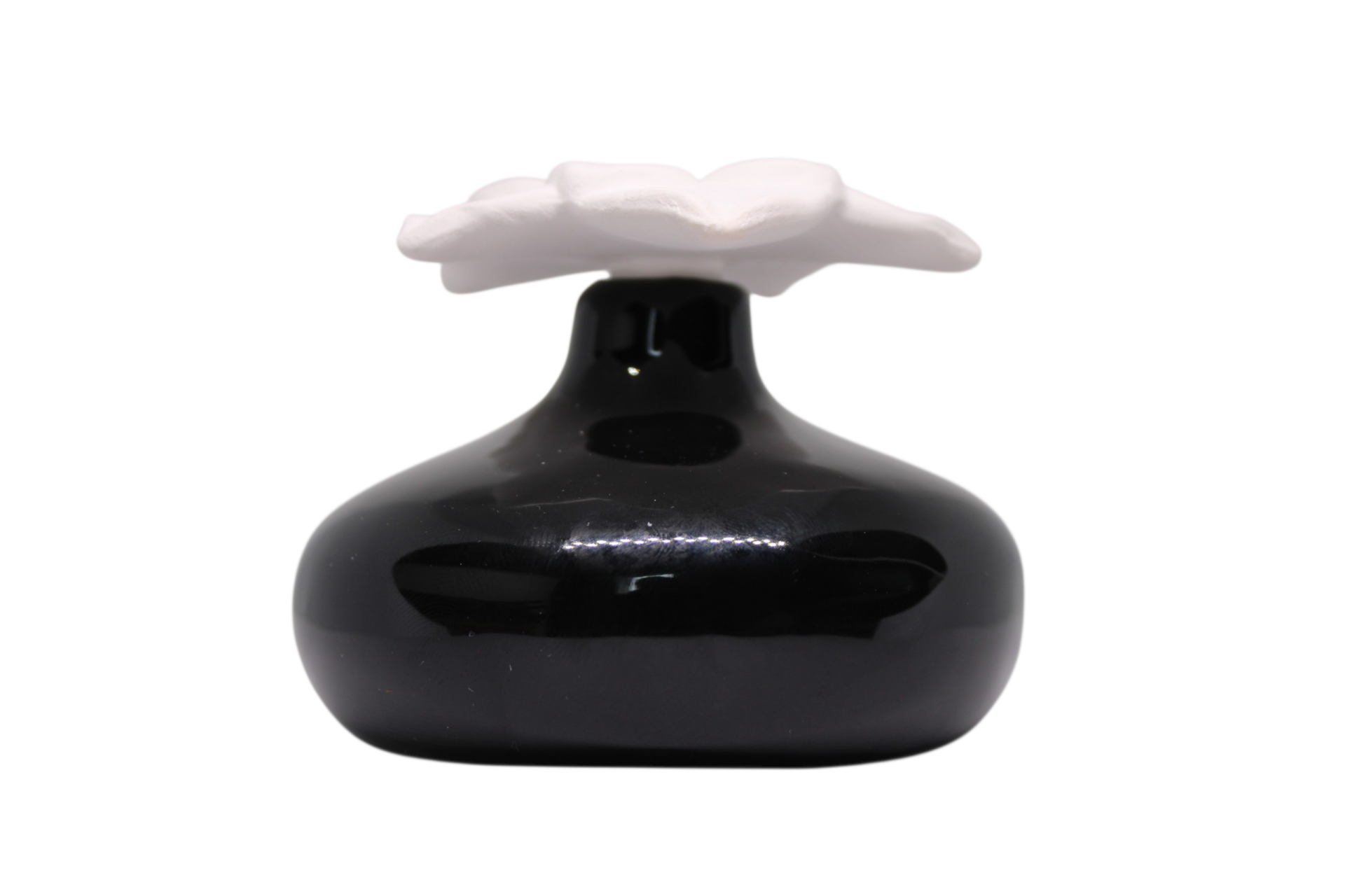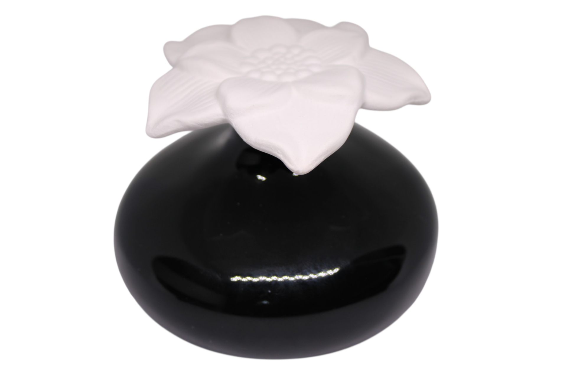 La fleur en céramique, travaillée avec précision, présente des pétales texturés et un cœur délicat qui évoquent l’artisanat haut de gamme. Sa finition mate absorbe naturellement les parfums d’ambiance ou les huiles essentielles, permettant une diffusion douce, progressive et sans électricité. Le vase noir, quant à lui, offre un contraste visuel saisissant grâce à sa surface brillante et profonde, idéale pour sublimer la blancheur immaculée de la fleur.